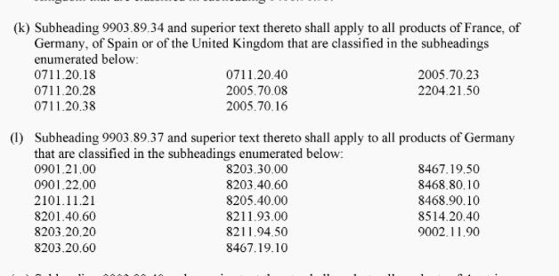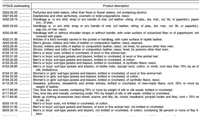 Here is a sample of HS codes subject to tariffs, taken from the original Federal Notice (10/09/2019):