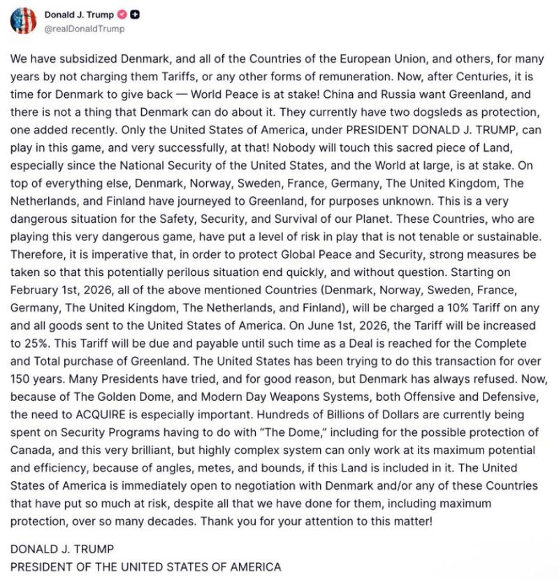 In an attempt to force Denmark into selling him Greenland, he has threatened tariffs eventually raising to 25% on EU members Denmark, Sweden, France, Germany, the Netherlands and Finland. [As well as non-EU members, the UK and Norway.]